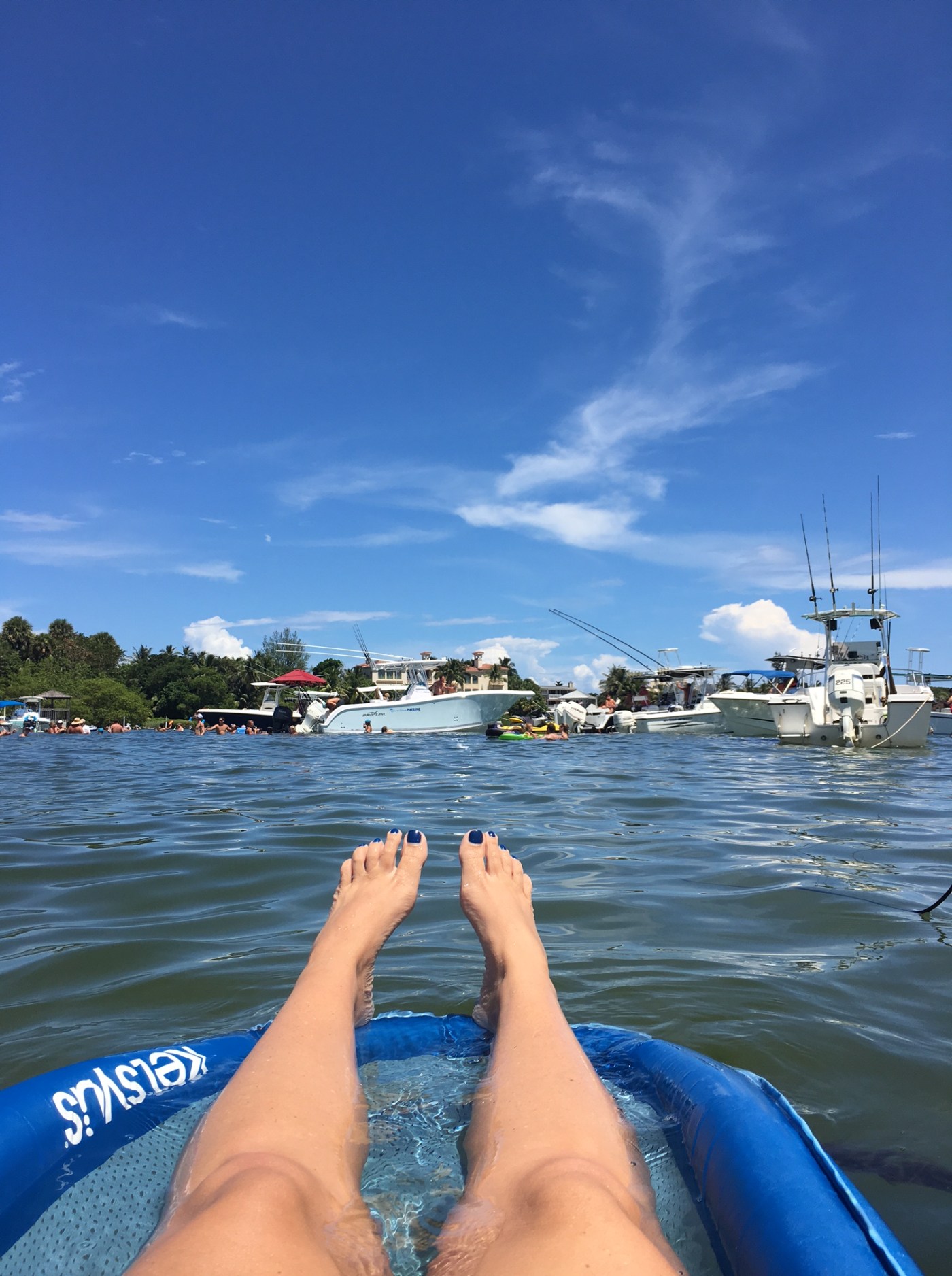 It was a good 10 minute kayak across to get to Beer Can Island. There’s also a lot of boats coming in and out of the inlet to watch out for. But we went early to avoid a crowd. It was already low tide when we arrived with the depth about 6 inches. We anchored down and setup shop. There were a few boats there when we arrived at about 10:45am. It definitely got busier as the day went on and the water level kept getting deeper which I actually liked so I could use my floaty! But I have to say with the inlet right there and the traffic, the water was a bit rough. We had perfect weather, which I’m always grateful for!